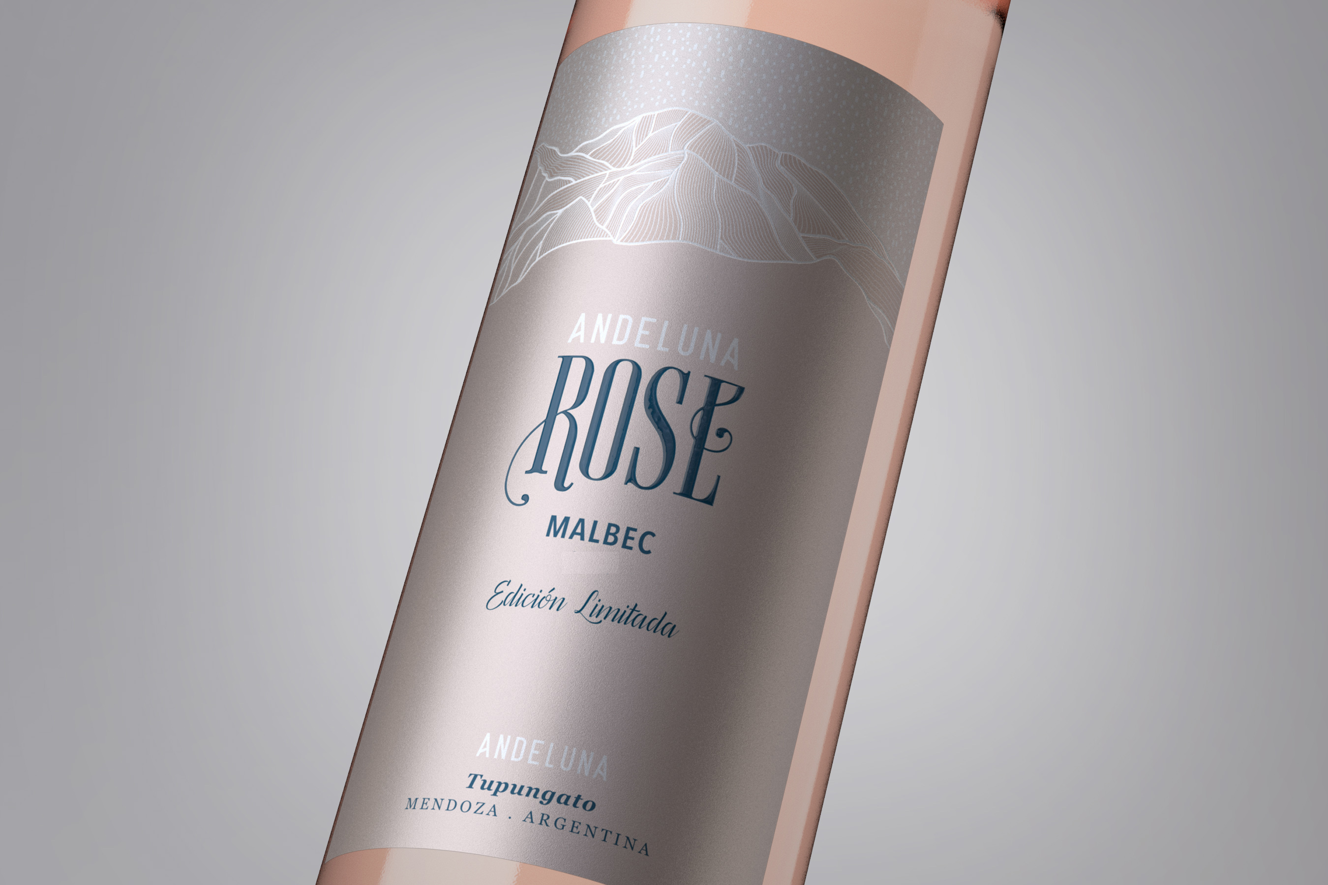 Andeluna Edición Limitada Rosé forma parte de la familia de vinos de Edición Limitada de la bodega. Se distingue por la delicada y elegante presentación, etiqueta de tonos plata y azules – que representa el azul profundo del cielo Gualtallary, fusionado con los sutiles azules de la cordillera de Los Andes y las gamas de grises de la luna -, cápsula plateada y botella Cartier.