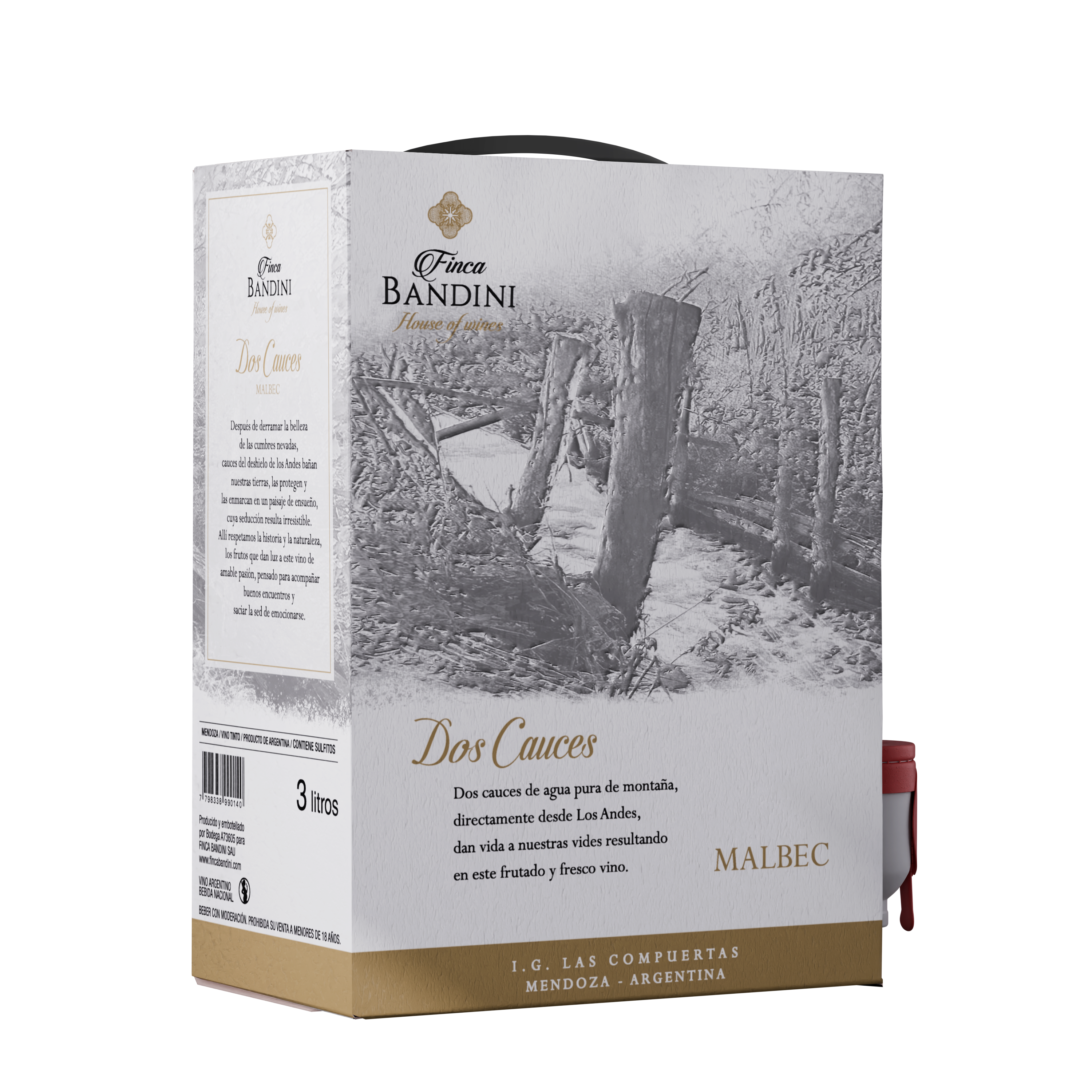 Dos Cauces Malbec es un 100% Malbec, sin paso por madera, elaborado con uvas provenientes de un terroir excepcional ubicado en la IG Las Compuertas, con crianza en huevos de concreto. Cada paso del proceso de elaboración fue pensado por el equipo enológico de Finca Bandini para asegurar la plena expresión de su potencial sensorial, aspectos perfectamente preservados en la flamante presentación bag in box.