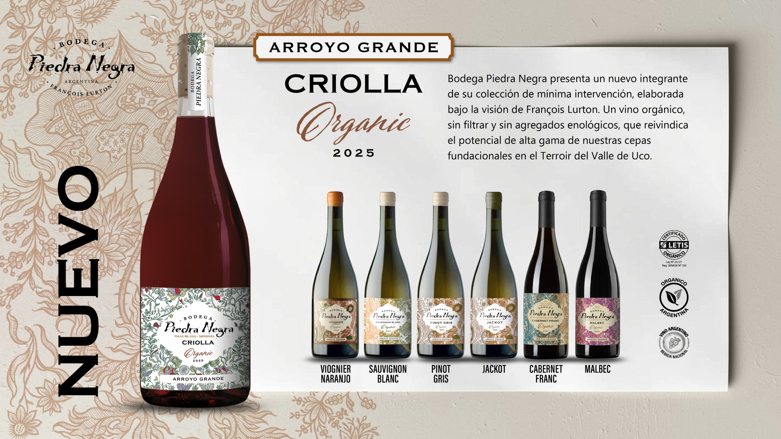 Este nuevo integrante se suma al portfolio de la línea Arroyo grande preexistente (Malbec, Naranjo, Cabernet Franc, Jackot, entre otros), reforzando la filosofía de Lurton de interpretar el terruño mendocino desde una perspectiva de respeto absoluto por la materia prima, el lugar y el legado histórico.