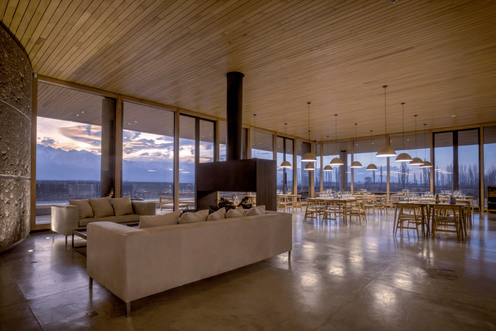 “Restaurante Abrasado, junto a las salas de catas y eventos, destaca con sus techos altos y una estética actual, con una vistosa cámara de maduración a la entrada y una barra al fondo en la que no suele faltar el bartender. Aunque ofrecen una completa carta que se destaca por su apartado de carnes, con opciones frescas, maduradas -como el ojo de bife madurado en seco, el T-bone madurado en ajo negro y el Filet madurado en alga combu- y pensadas para compartir, la inmensa mayoría de los clientes elige alguno de sus menús (Andes, 100 Aniversario y Abrasado) ya que todos tienen el maridaje incluido”.